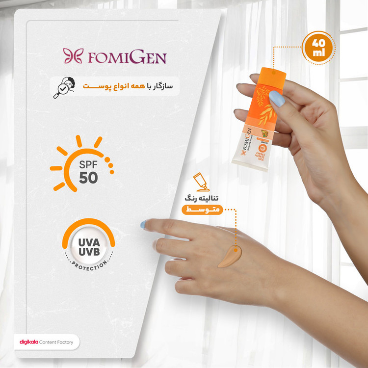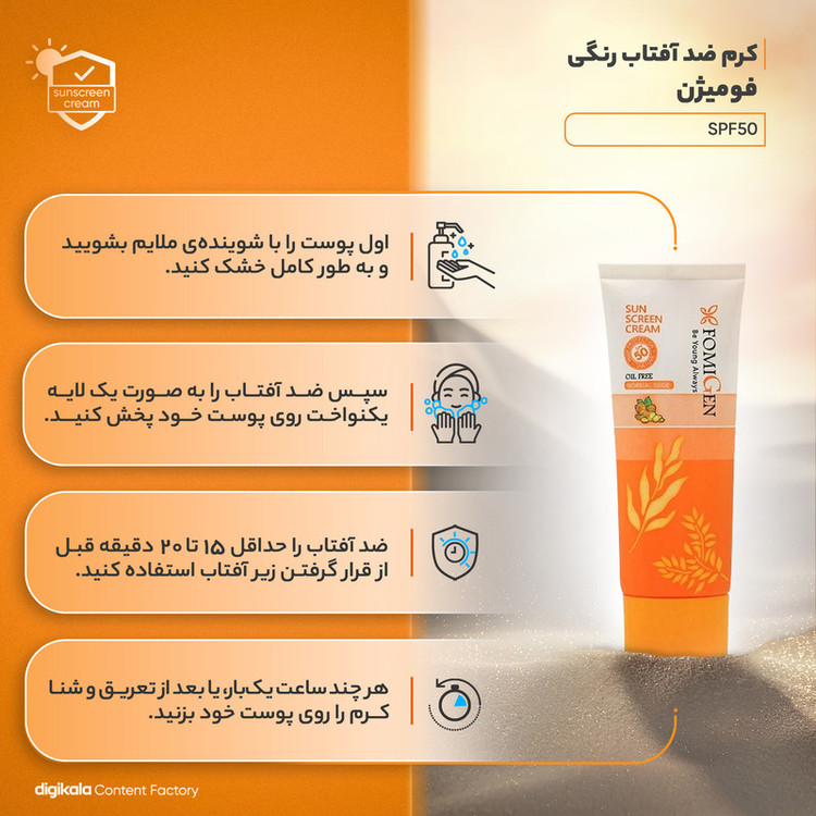 راهنمای استفاده : 15 دقیقه قبل از قرار گرفتن در معرض آفتاب مقداری از کرم ضدآفتاب Normal Beige فومیژن را به پوست تمیز آغشته کنید و آن را به آرامی ماساژ دهید تا کاملا جذب پوست شود. برای اثر بخشی بهتر است هر 3 تا 4 ساعت تمدید شود.