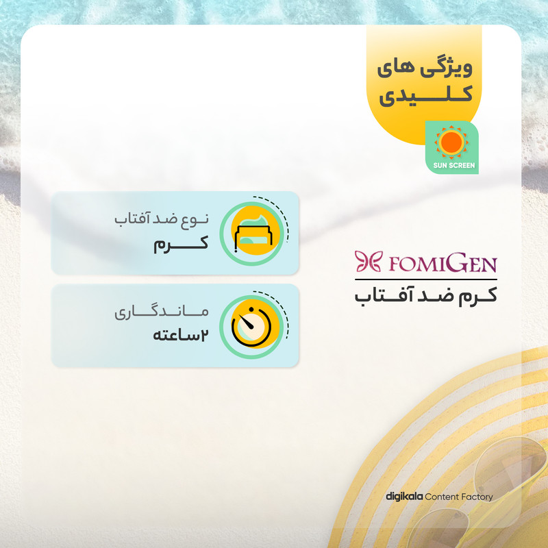 کرم ضد آفتاب بژ نرمال Fomigen SPF50 از پوست صورت شما در برابر اشعه های مضر آفتاب ( UVA و UVB )محافظت می کند و مانع از لک، تیرگی و آفتاب سوختگی در بافت پوست می شود. کرم ضد آفتاب رنگی پوست چرب فومیژن دارای رنگ روشن(بژ متوسط) بوده که به طور کامل و یکدست عیوب پوست صورت را پوشانده و مانع از ظاهر شدن آن ها می شود. ضد آفتاب رنگی فومیژن دارای ساختار و بافت سبک می باشد که به خوبی جذب می شود و از ایجاد چربی اضافی و سنگین روی بافت پوست صورت چرب خانم ها پیشگیری می کند. کرم ضد آفتاب فومیژن موجب مات و یکنواخت شدن بافت پوست می شود و برای استفاده روزانه افرادی که دارای پوست چرب هستند مناسب می باشد. همچنین ضد آفتاب فومیژن تا حدودی از بروز جوش و قرمزی پوست صورت پیشگیری می کند. کرم ضدآفتاب Normal Beige فومیژن حاوی آلانتوئین، ستئاریک اسید، بیزواکس، تیتانیوم دی اکساید و گلیسیرین میباشد.