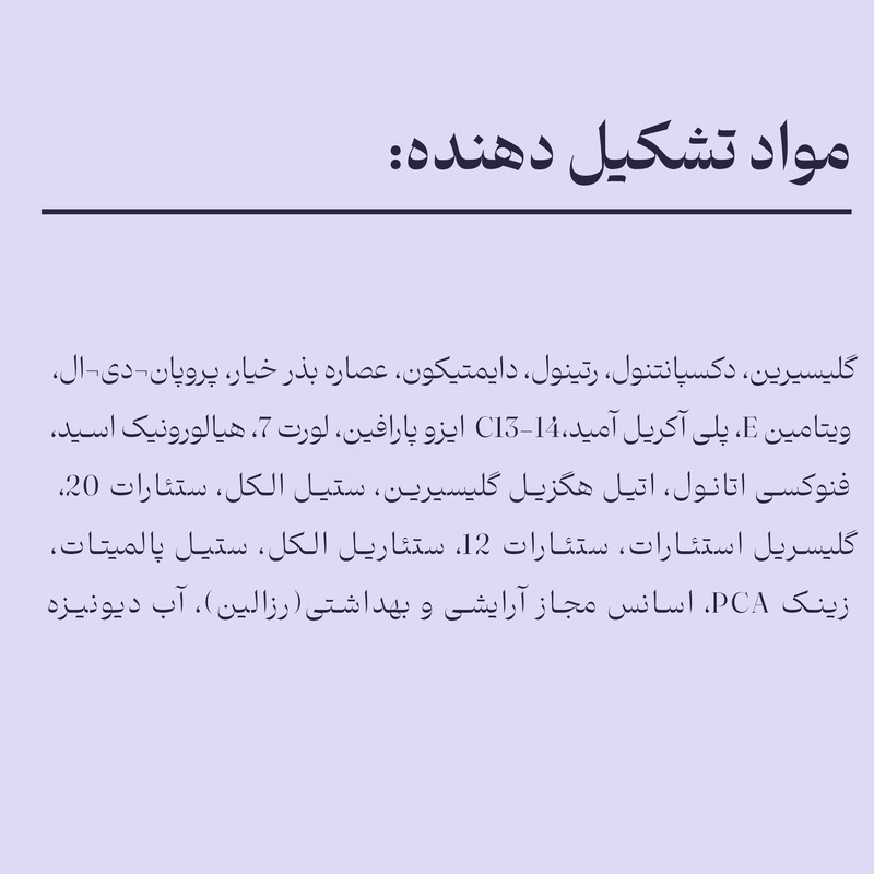 ویتامین E , هیالورونیک اسید , بدون پارابن , فاقد چربی , گلیسیرین , غنی شده با ویتامین , رتینول