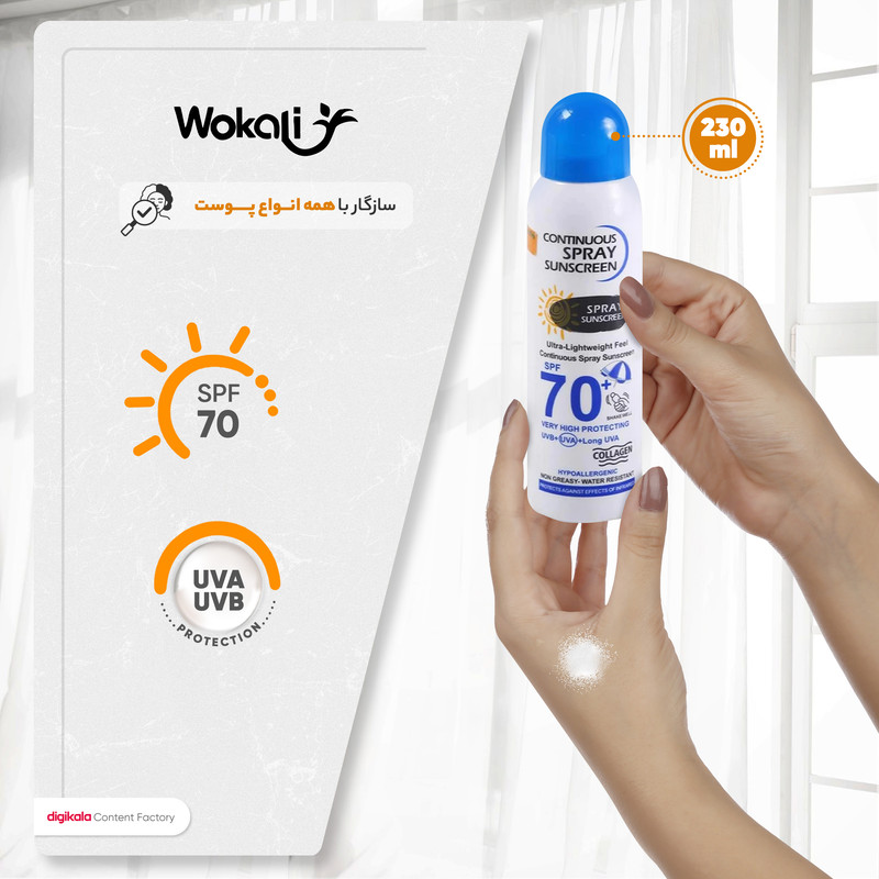 اسپری ضدآفتاب بیرنگ وکالی با SPF 70، یک انتخاب ایدهآل برای محافظت کامل از پوست در برابر اشعههای مضر UVA و UVB است. این محصول با فرمولاسیون بدون رنگ خود، بدون ایجاد تغییر در رنگ طبیعی پوست، به شما امکان میدهد از محافظتی بینقص و نامرئی برخوردار شوید. طراحی اسپری این ضدآفتاب با حجم 230 میلیلیتر، استفاده آسان و سریع آن را برای مناطق وسیعی از پوست، مانند صورت، گردن و بدن، امکانپذیر میکند. این اسپری ضدآفتاب با عصاره آووکادو و کلاژن، نه تنها از پوست در برابر آسیبهای خورشیدی محافظت میکند، بلکه به تغذیه و آبرسانی آن نیز کمک میکند. ویژگی ضد آب آن، تضمینی است برای اینکه حتی در شرایط تعریق یا تماس با آب، محافظت خود را از دست ندهد. ماندگاری دو ساعته این محصول، اطمینان خاطر را برای استفاده در طول روز فراهم میآورد. اسپری ضدآفتاب بیرنگ وکالی، انتخابی مناسب برای بانوان و آقایانی است که به دنبال یک محافظت قوی، موثر و بیرنگ هستند. این محصول، پوست شما را در برابر آسیبهای ناشی از نور خورشید محافظت میکند، در حالی که با ترکیبات مغذی خود، به سلامت و زیبایی پوست نیز کمک میکند.