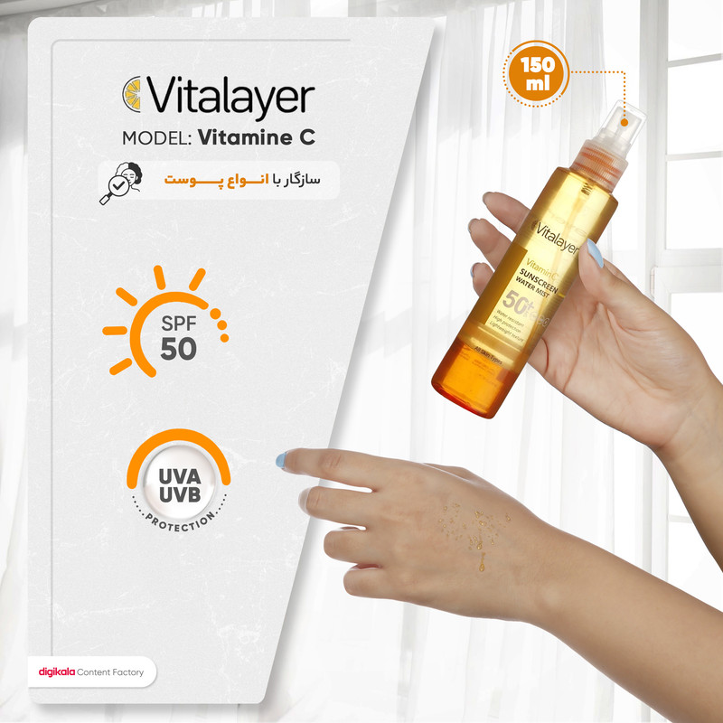 اسپری ضدآفتاب بدون رنگ ویتالیر با SPF 50 یکی از محصولات برتر در زمینه مراقبت از پوست است که به راحتی هر نوع پوستی را در برابر اشعههای مضر UVA و UVB محافظت میکند. این محصول با حجم 150 میلیلیتر و ماندگاری 2 ساعته، برای استفاده بر روی صورت و بدن طراحی شده و به خصوص برای بانوان و آقایان مناسب است. ویژگیهای منحصربهفرد اسپری ویتالیر شامل عدم رنگدهی به پوست، بافت سبک و جذب سریع است که تجربهای لذتبخش از استفاده روزانه را به ارمغان میآورد. وجود ویتامین سی و هیالورونیک اسید در ترکیب این محصول، آن را به یک آنتیاکسیدان قوی و آبرسان موثر تبدیل کرده که علاوه بر حفاظت، به تغذیه و ترمیم پوست نیز کمک میکند. بستهبندی پلاستیکی و اسپریای این ضدآفتاب، استفاده آسان و یکنواخت را ممکن میسازد. با مقاومت بالا در برابر آب و تعریق، این محصول گزینهای ایدهآل برای استفاده در مناطق ساحلی، کنار دریا و استخرها است. همچنین، عدم ایجاد جوش و حساسیت، این محصول را برای انواع پوست، حتی پوستهای حساس، مناسب میسازد. ویتالیر با مجوز رسمی از سازمان غذا و دارو و تولید شده در ایران، تضمینی برای کیفیت و اطمینان از سلامت پوست شما است.