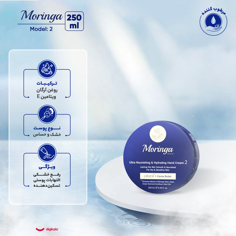کرم دست فوق مغذی و آبرسان مورینگا اِمو 2 با قدرت آبرسانی بالا و بافت بسیار سبک و ابریشمی، به سرعت جذب پوست شده و منجر به حفظ و تامین رطوبت برای پوستهای خشک می¬شود. این محصول علاوه بر تامین مواد مغذی، موجب کاهش سوزش، خارش، التهاب و خشکی پوست میشود.