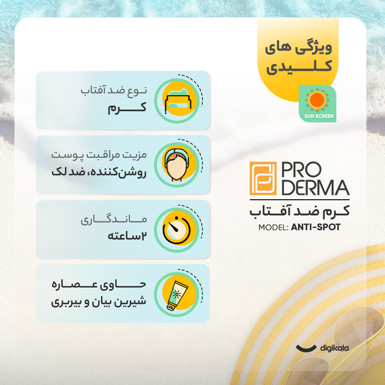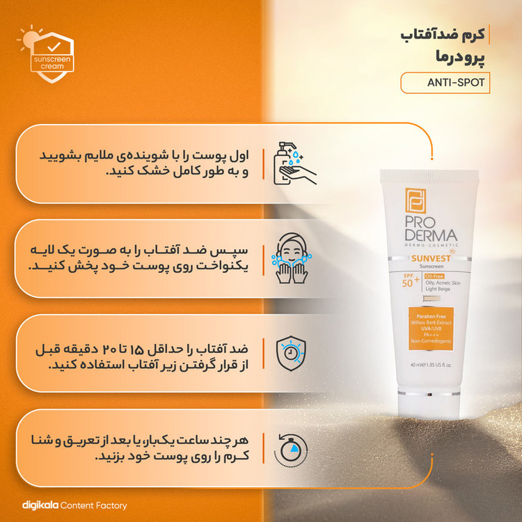 راهنمای استفاده : قبل از قرار گرفتن در معرض تابش نور خورشيد، مقدار کافي از کرم ضدآفتاب پرودرما را بطور يکنواخت برروي پوست ماليده و به آرامي ماساژ دهيد. مصرف را هر 2 تا 4 ساعت يکبار تجديد فرماييد.